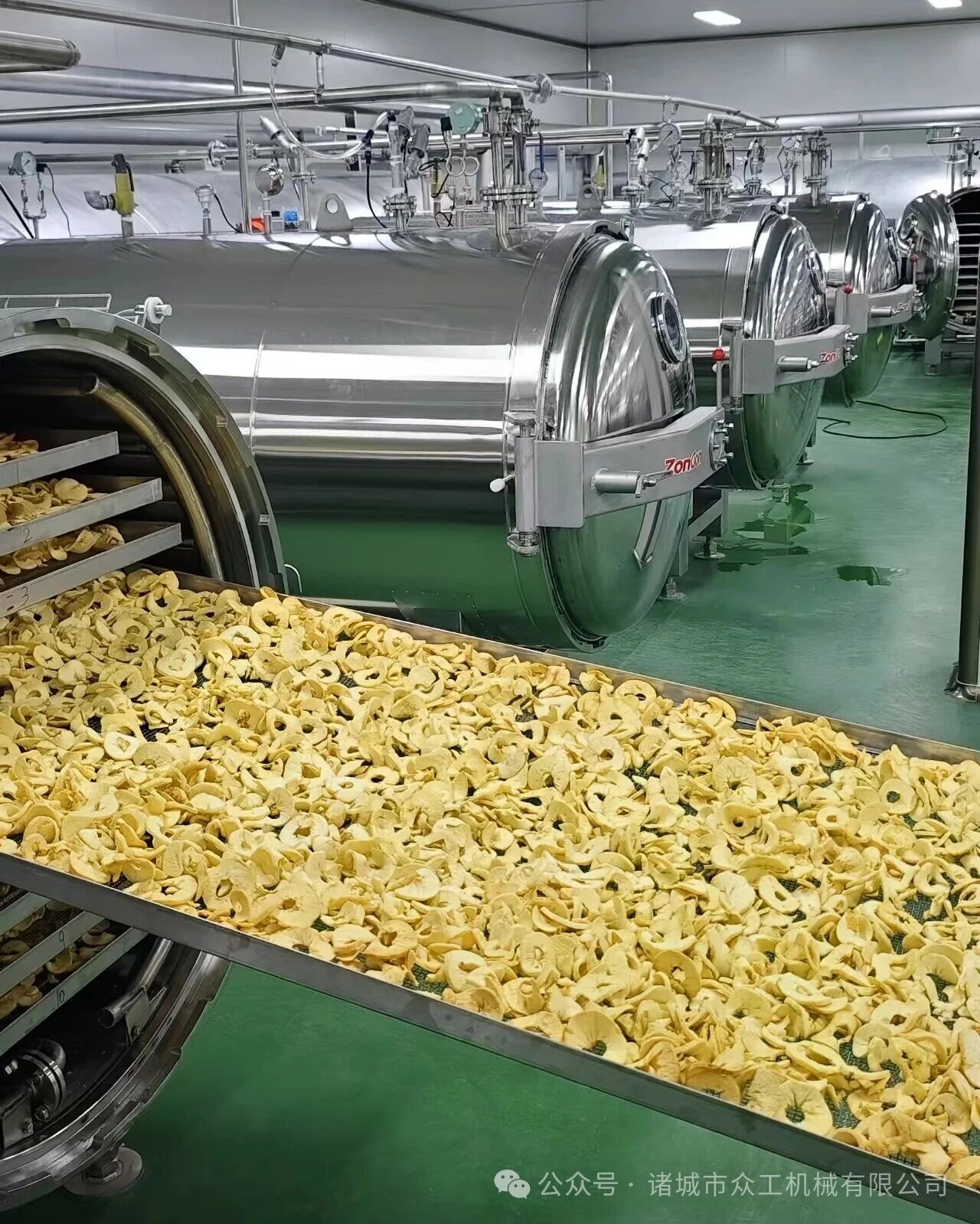 According to the production characteristics of apple chips, this equipment uses precise temperature and pressure control technology, achieving more thorough freshness retention and more uniform puffing. While preserving the natural nutrition and flavor of the apples, it significantly enhances the crispness and rehydration properties of the chips. From washing and slicing to the finished product, the fully automated production line is efficiently connected, with a daily processing capacity of up to 2 tons, helping customers seize market opportunities!