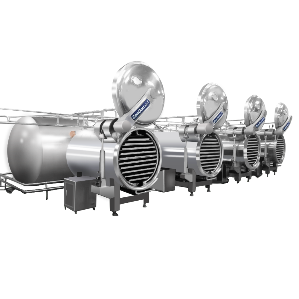 The need to handle these huge baskets has opened the way for ABRS. The "Automatic Batch Retort System" (ABRS) refers to the fully automated integration of all the hardware used to transport baskets from the loading station to the sterilization tank, and from there to the unloading station and packaging area. The global processing system can be monitored by the basket/pallet tracking system