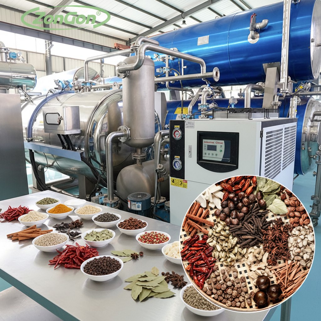Sterilization parameters (temperature, time) can be flexibly adjusted for different spice characteristics (e.g., Sichuan pepper, black pepper, chili, cinnamon, star anise).